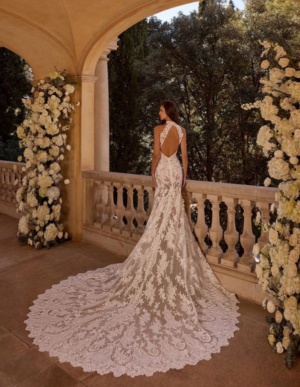 Mermaid wedding dress with a romantic and classic style. It features a halter neckline, made entirely of delicate rebrodé lace appliqués and embroidered beadwork, creating sheer detailing on the skirt.