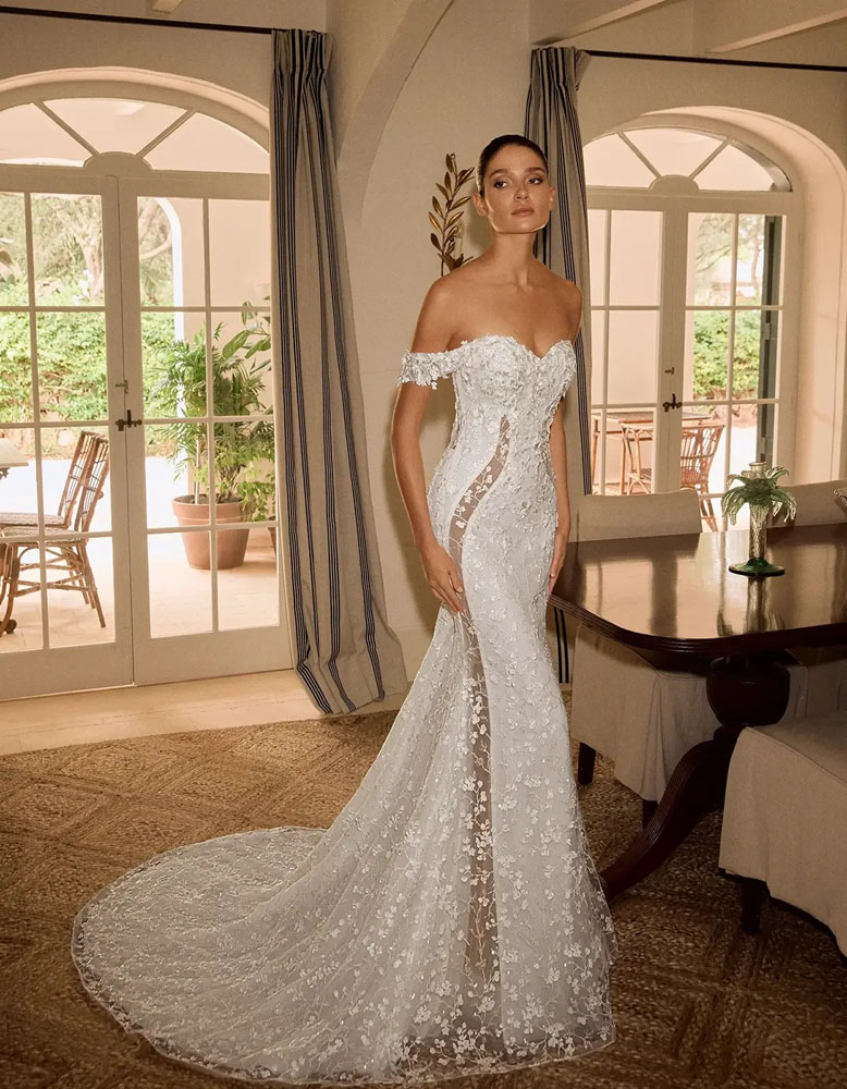 Modern style mermaid dress made entirely of delicate floral lace fabric and features semi-transparent openings on the sides.