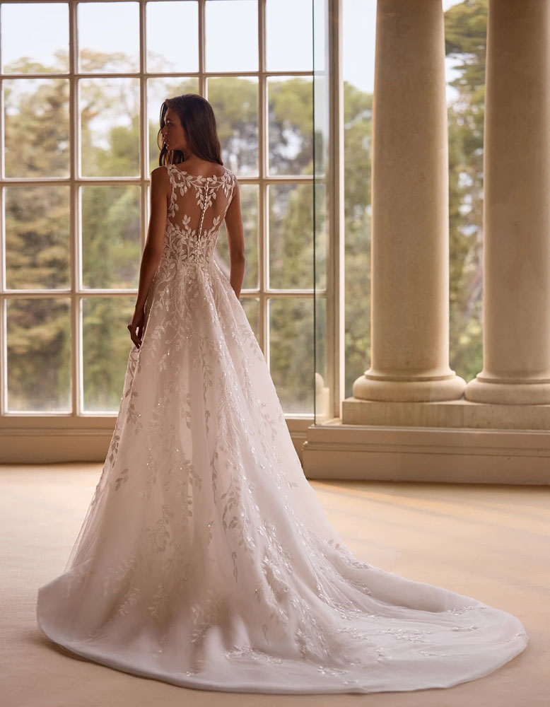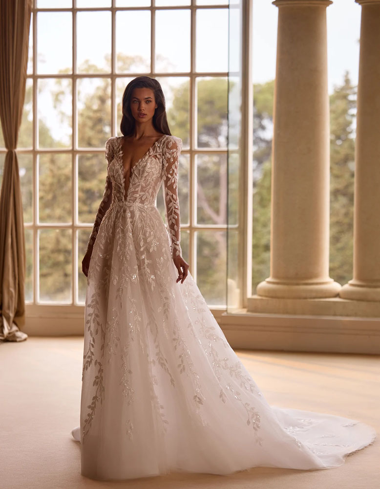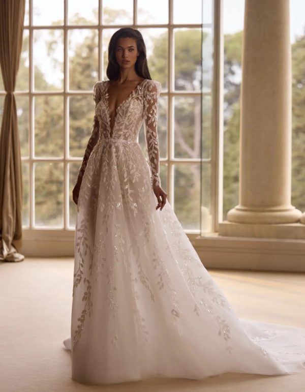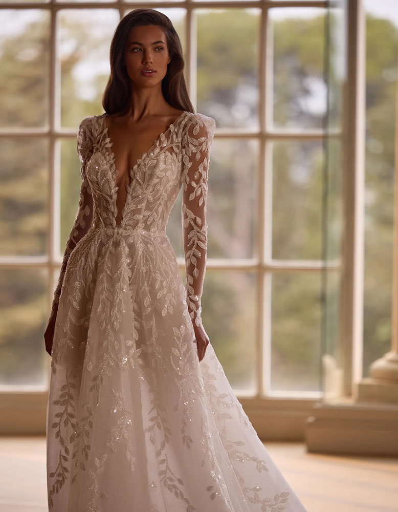 A-line wedding dress with a romantic and modern style. It features a V-neckline bodice, made entirely with beaded lace appliqués and a long train. It is complemented by detachable long sleeves to create a double look.